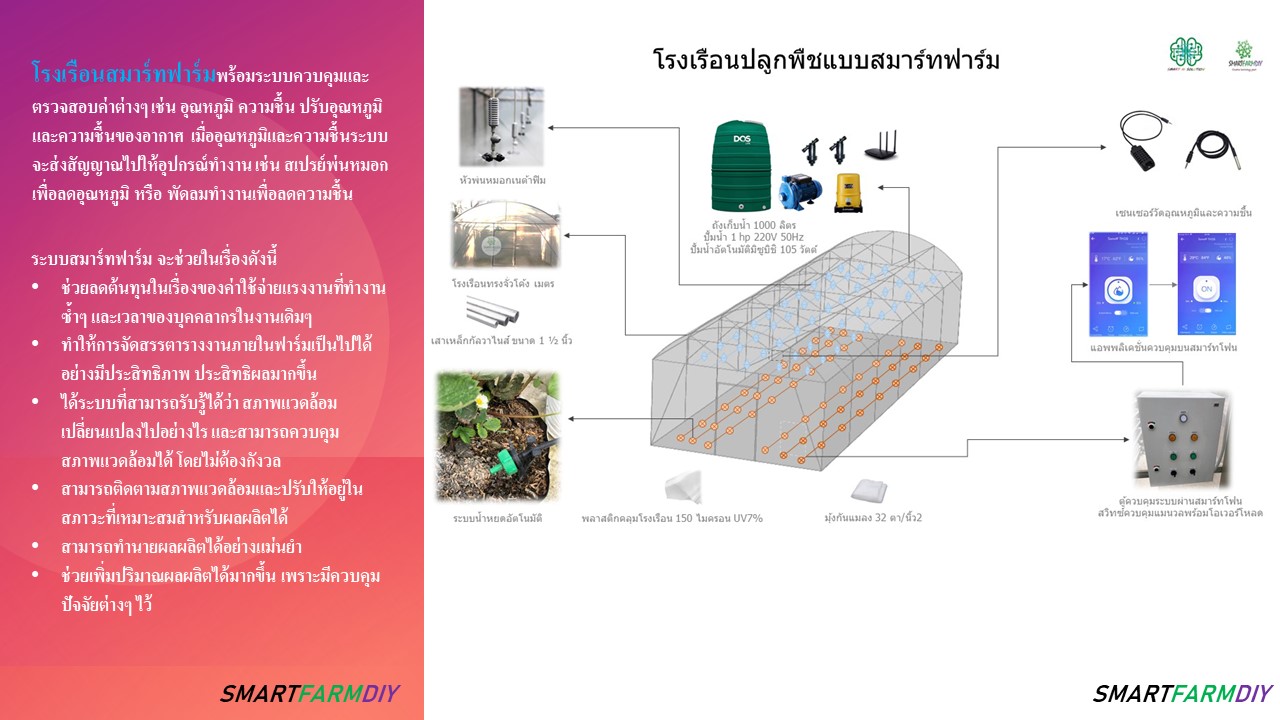 โรงเรือนสมาร์ทฟาร์มพร้อมระบบควบคุมและตรวจสอบค่าต่างๆ เช่น อุณหภูมิ ความชื้น ปรับอุณหภูมิและความชื้นของอากาศ เมื่ออุณหภูมิและความชื้นระบบจะส่งสัญญาณไปให้อุปกรณ์ทำงาน เช่น สเปรย์พ่นหมอก เพื่อลดอุณหภูมิ หรือ พัดลมทำงานเพื่อลดความชื้น